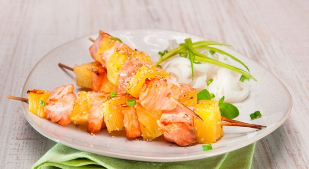 Brocheta de salmón y piña caramelizada